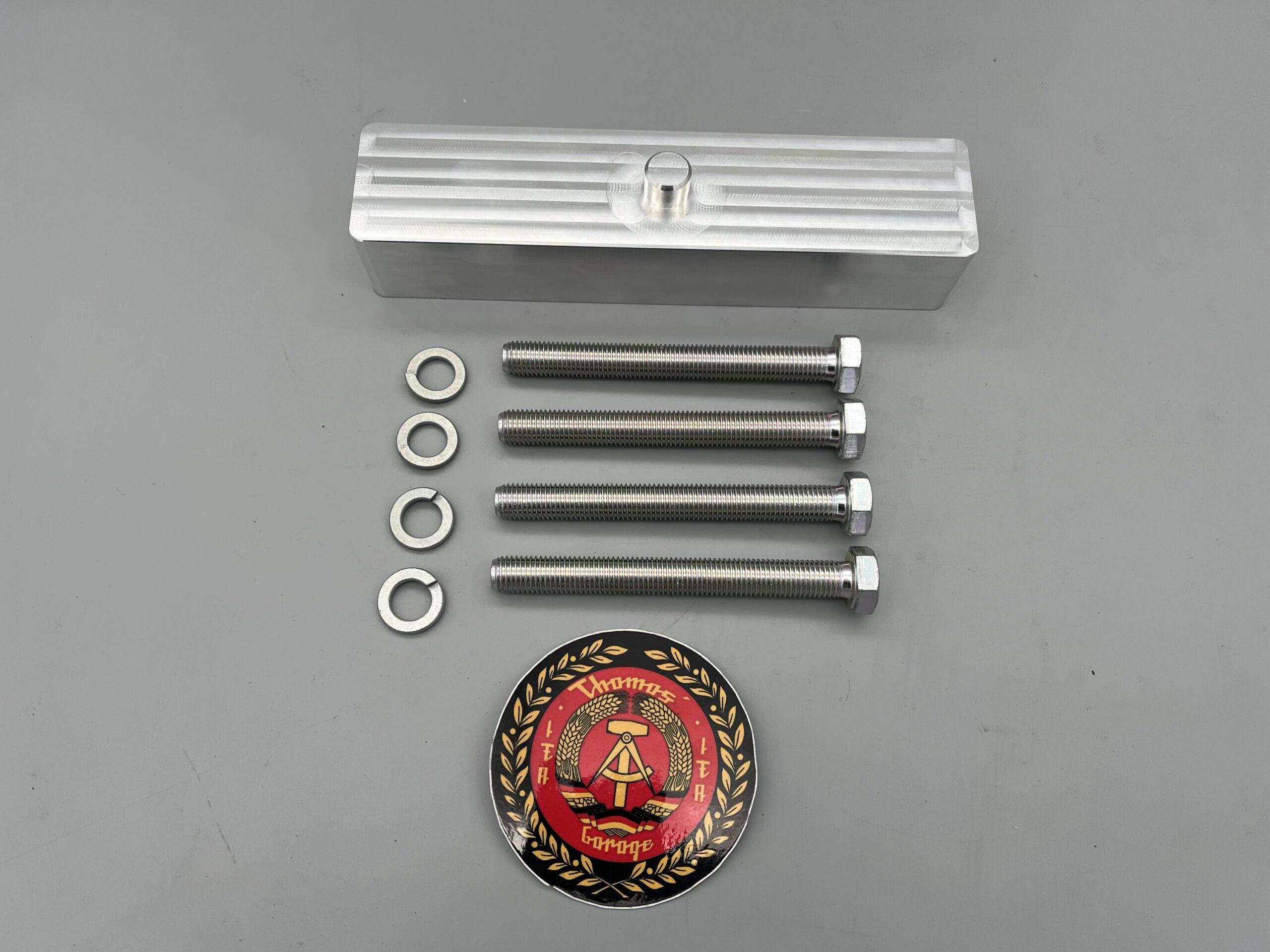 Dieses Produkt löst Eure Probleme dahingehend, dass die Blattfeder an der Hinterachse (in diesem Set ausschließlich für die Hinterachse!!) mehr Luft bekommt. Der “Klotz” wird einfach unter die Blattfeder gelegt, mit den mitgelieferten 10.9er Schrauben befestigt und dadurch drückt man die Karosse ein Stück hoch.