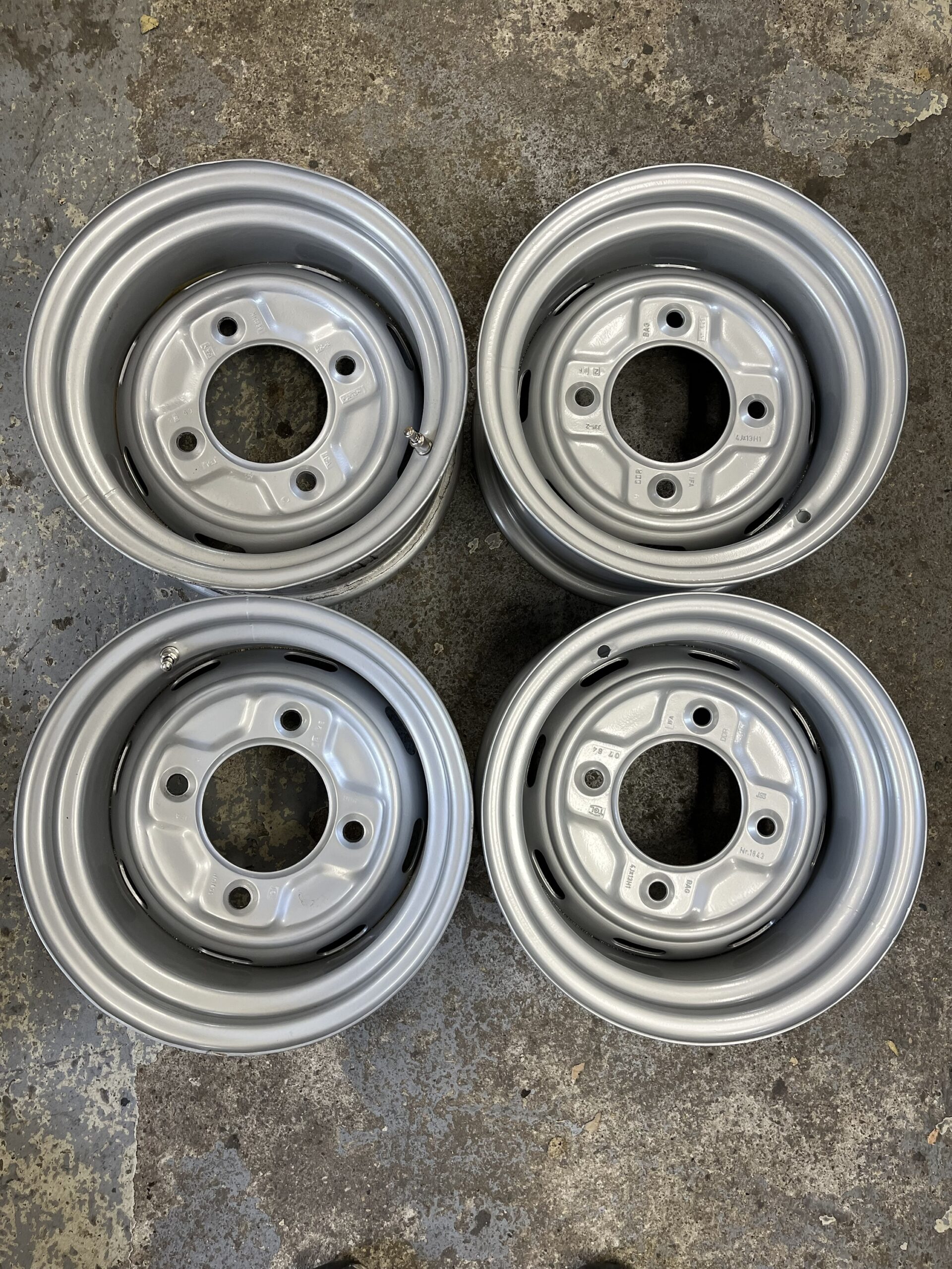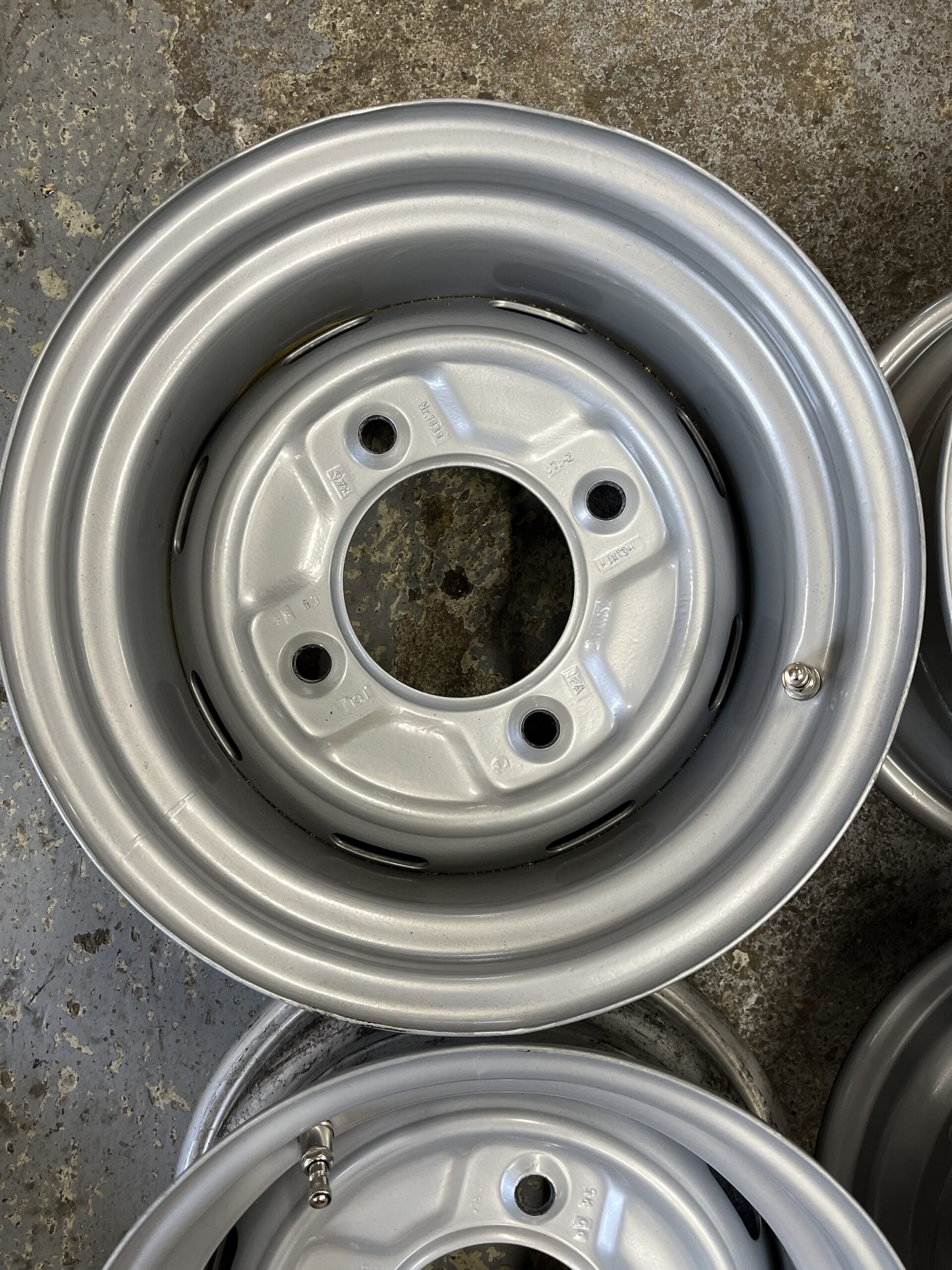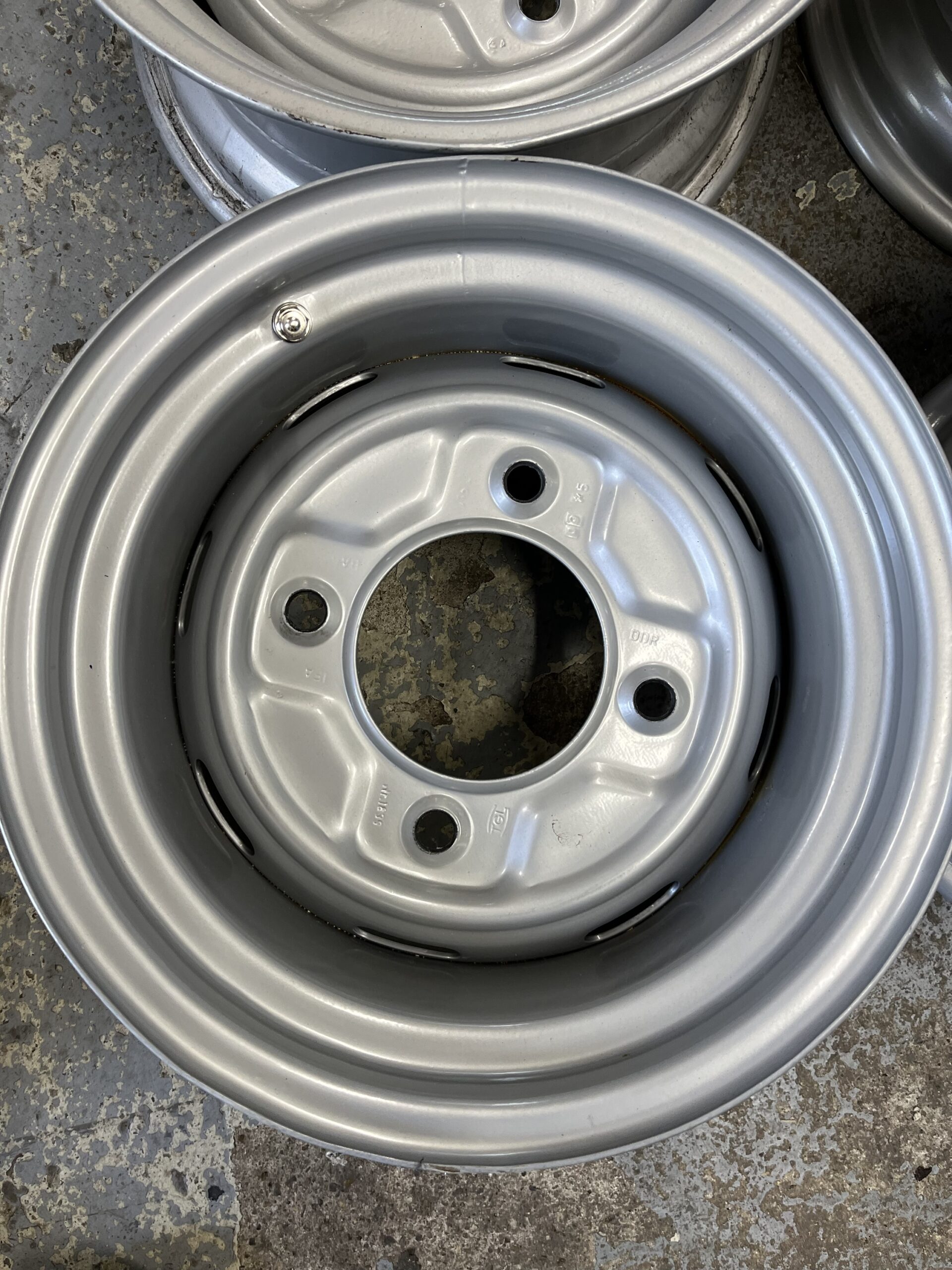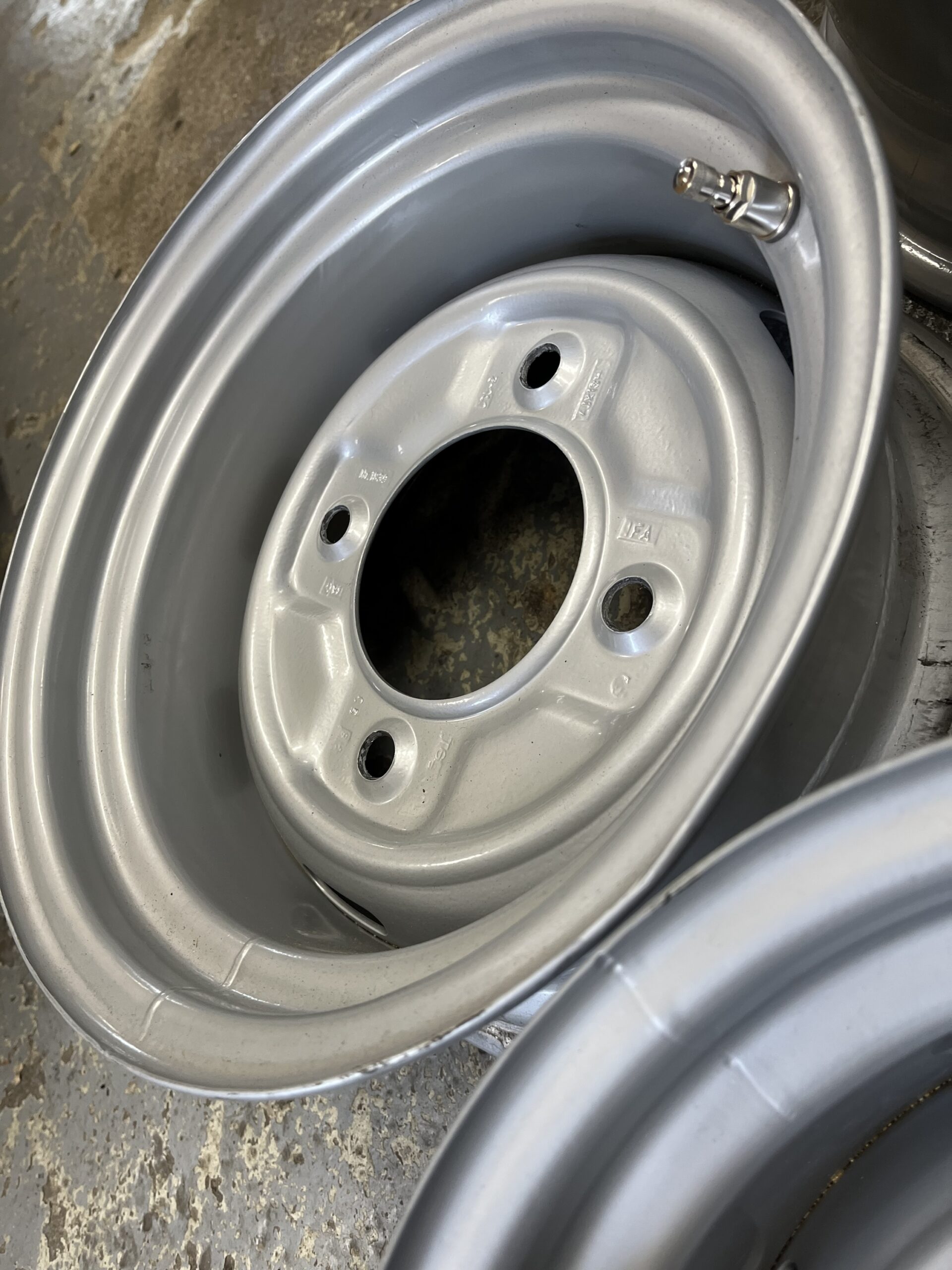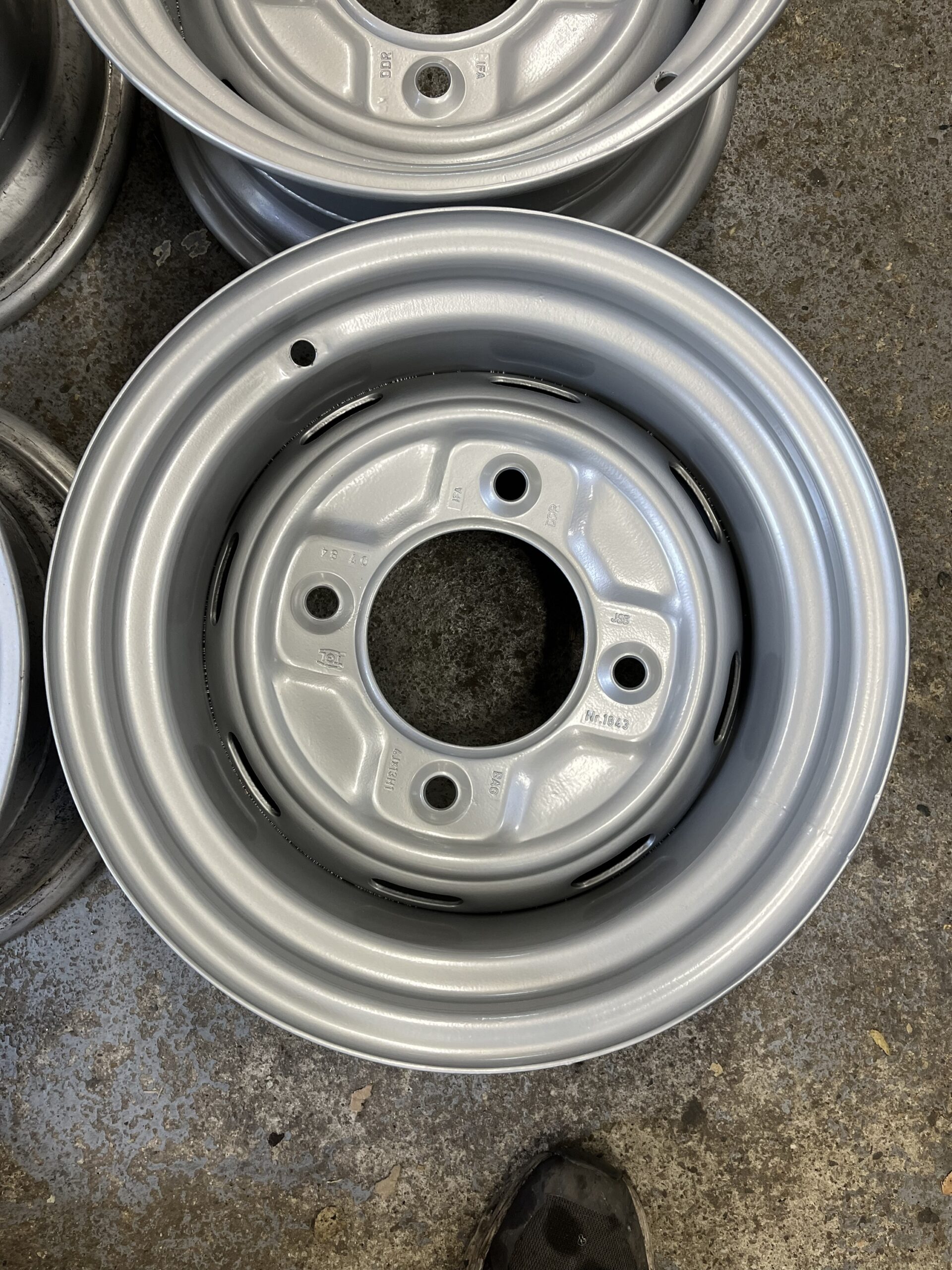 4 wunderschön umgearbeitete Originalfelgen (OHNE Aufnahme für Radkappe / Lochkreis 4×160) für Wartburg oder Trabant in 6,5×13″. Die Einpresstiefe ist schwer zu ermitteln, denke aber einstellig 😀 Beim Trabant passt dieser Satz ohne größere Anpassungen im Radhaus. Maximal einen “Mü” die Radhauskante schneiden. Bei originalhöhe und bis TF120 ohne Anpassungen fahrbar. Beim Wartburg sollten die gänzlich ohne Probleme passen. Ich empfehle für Trabant einen 175/50 R13 Reifen (gerne auf Anfrage als Komplettrad) aufzuziehen.
