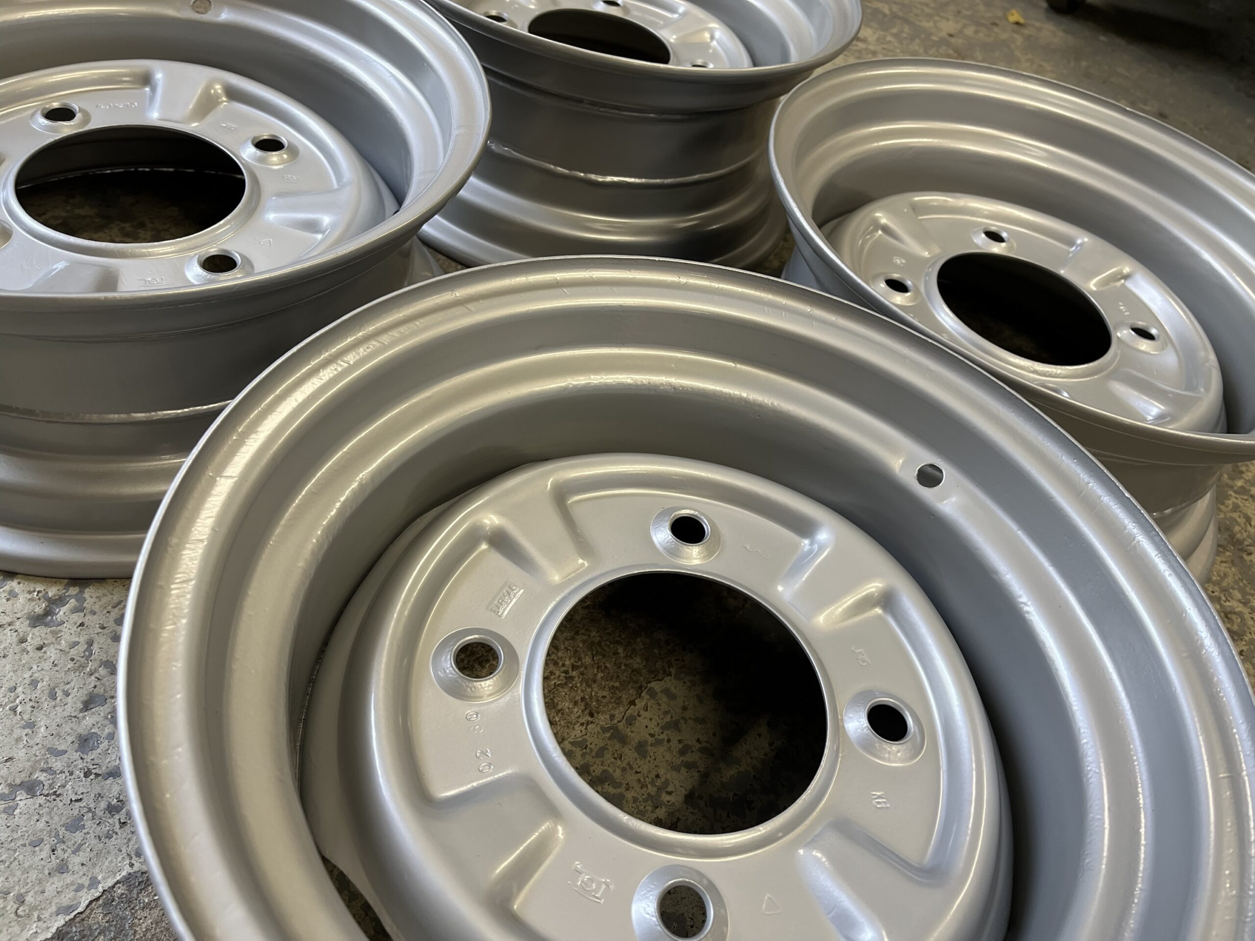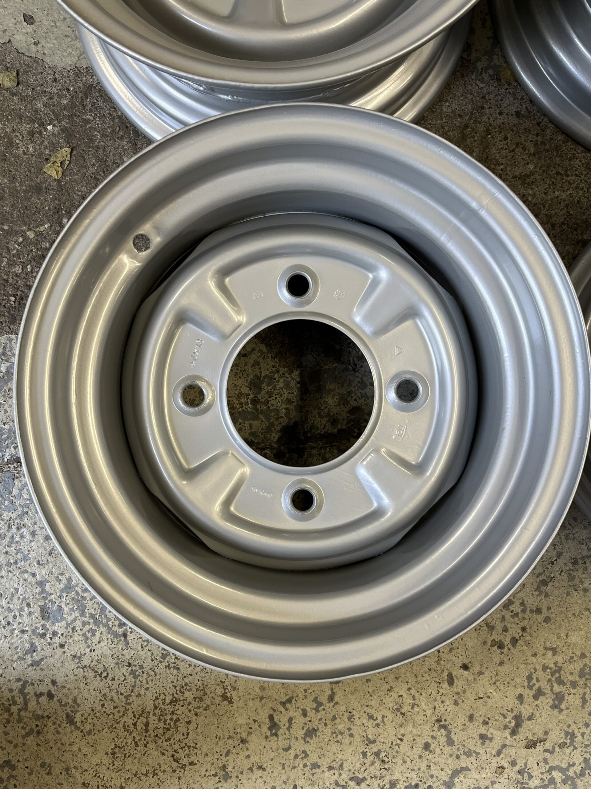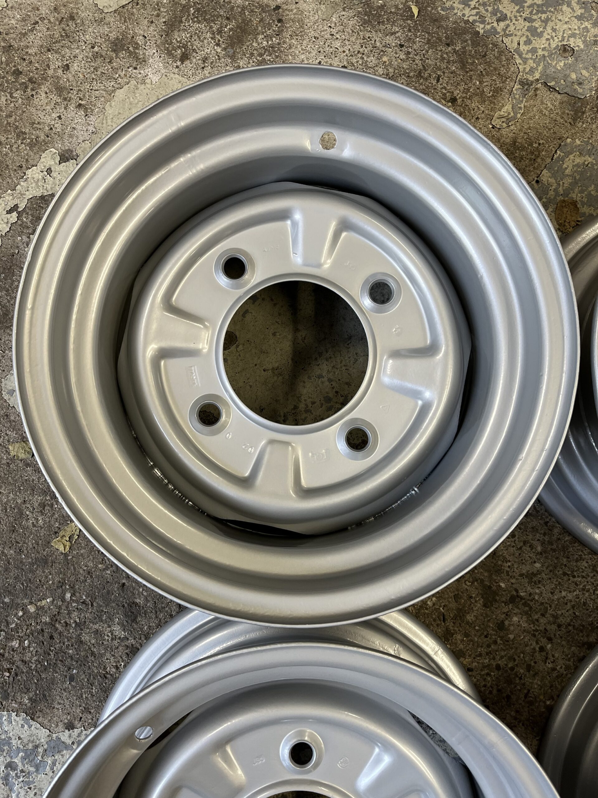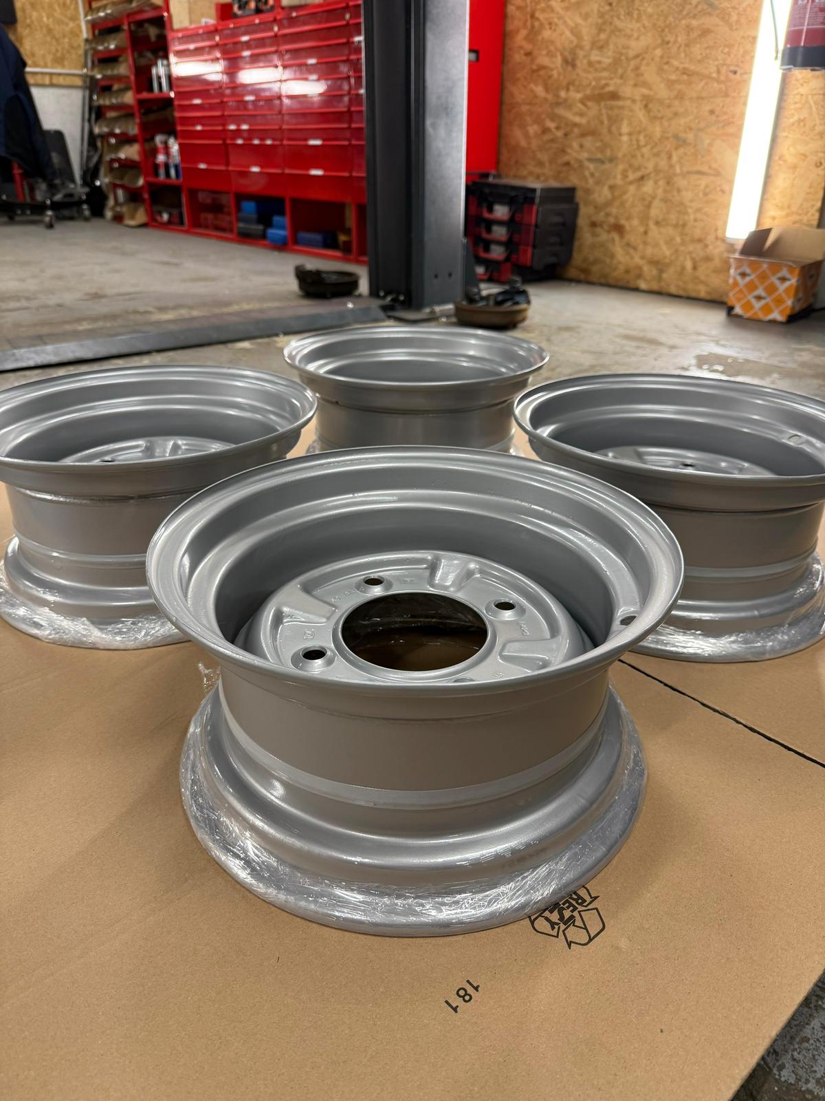 4 wunderschön umgearbeitete Originalfelgen (OHNE Aufnahme für Radkappe / Lochkreis 4×160) für Wartburg oder Trabant in 6,5×13″. Die Einpresstiefe ist schwer zu ermitteln, denke aber einstellig 😀 Beim Trabant passt dieser Satz ohne größere Anpassungen im Radhaus. Maximal einen “Mü” die Radhauskante schneiden. Bei originalhöhe und bis TF120 ohne Anpassungen fahrbar. Beim Wartburg sollten die gänzlich ohne Probleme passen. Ich empfehle für Trabant einen 175/50 R15 Reifen (gerne auf Anfrage als Komplettrad) aufzuziehen.