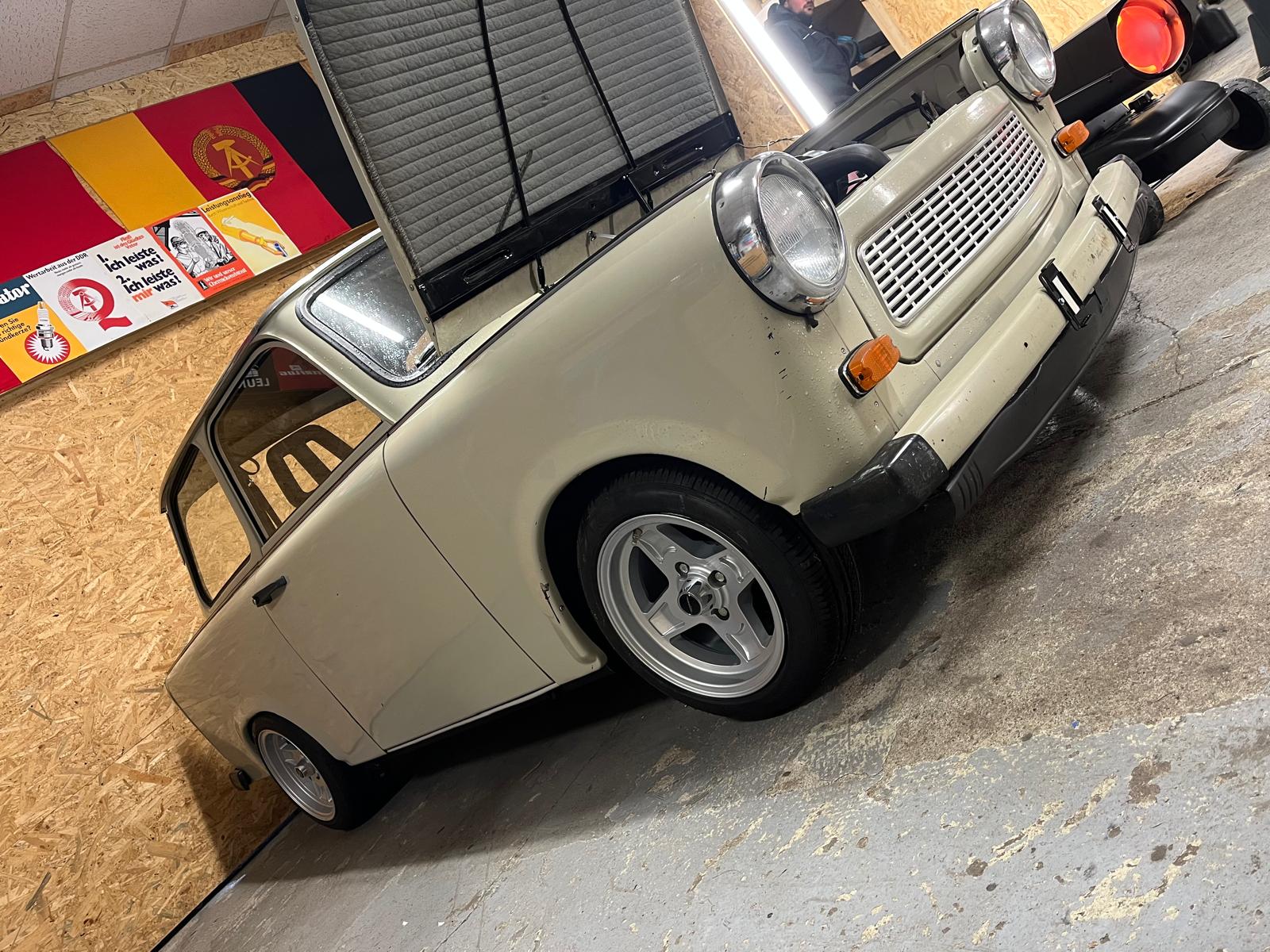 Anbaubeispiel zeigt einen Trabant mit unseren 4×100 Trommeln, kleiner Stuko hinten, Kotflügel HA ca. 10mm gezogen, Vorderachse mit 20mm Spurplatte