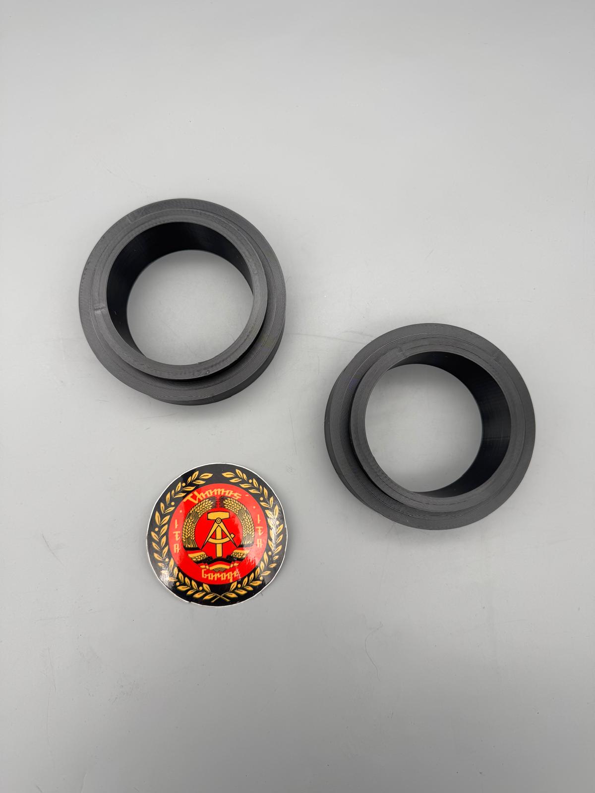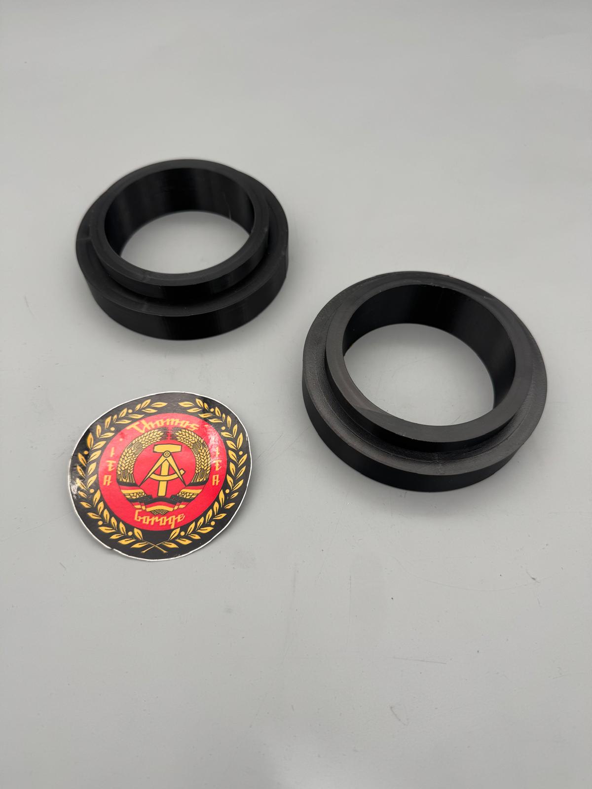 Kann man verwenden, wenn einem das originale Fahrwerk noch nicht hoch genug ist (#Gelächter), irgendeine Tieferlegung doch zu tief ist oder man eine Höhendifferenz im Fahrwerk generell ausgleichen will / muss. Der Federteller wird einfach vorne oben unter das bestehende Gummidomlager gepackt (oder ersetzt letzteres). Federrate der Spiralfeder bleibt somit identisch.