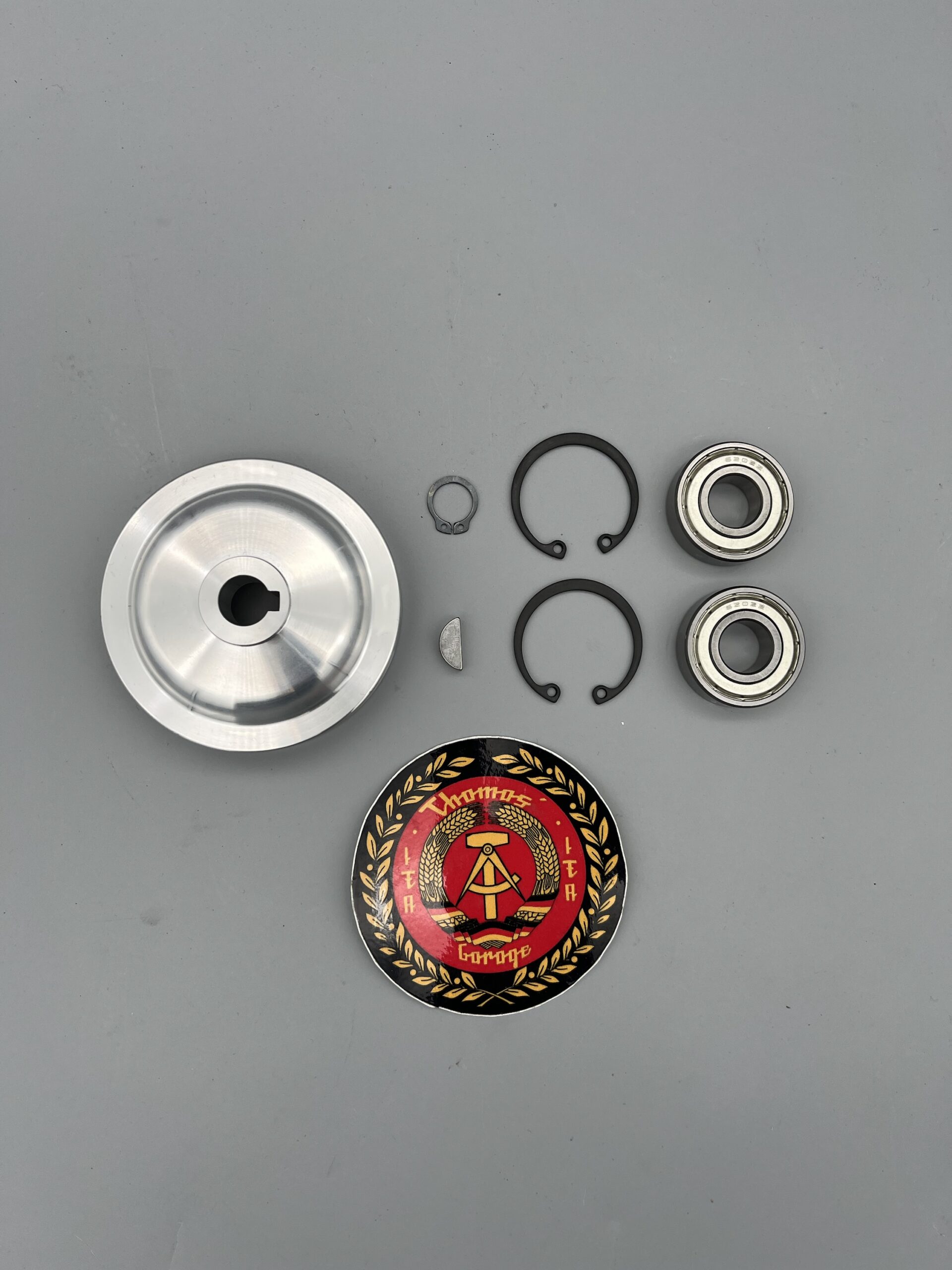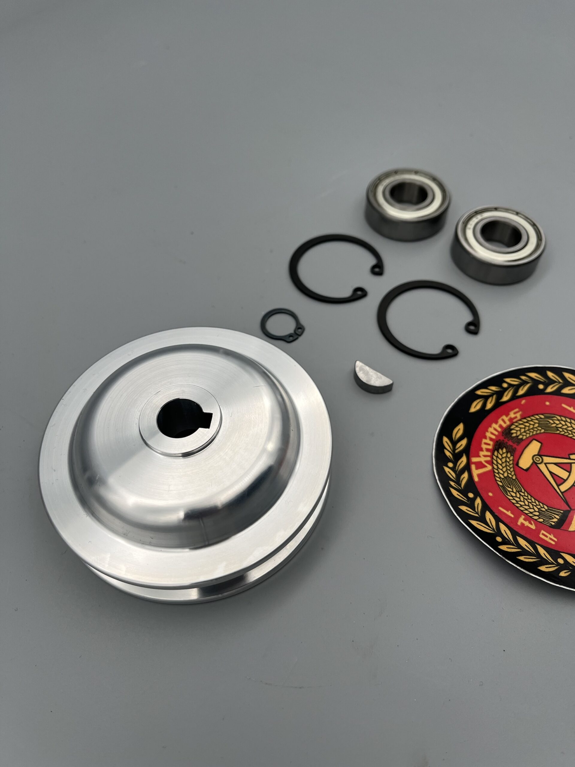 Neue und aus Aluminum gefertigte Riemenscheibe für das Trabant Lüfterrad. Im Durchmesser 8% kleiner und generiert somit etwas mehr Kühlluft für die Zylindergarnitur.