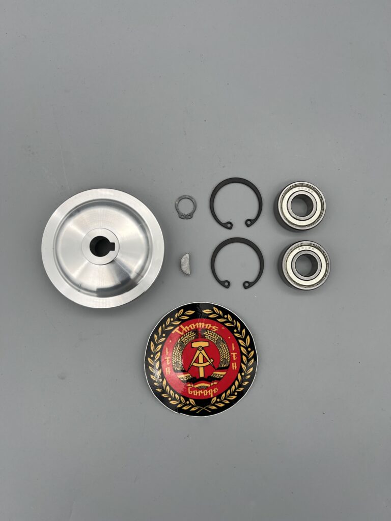Neue und aus Aluminum gefertigte Riemenscheibe für das Trabant Lüfterrad. Im Durchmesser 8% kleiner und generiert somit etwas mehr Kühlluft für die Zylindergarnitur.