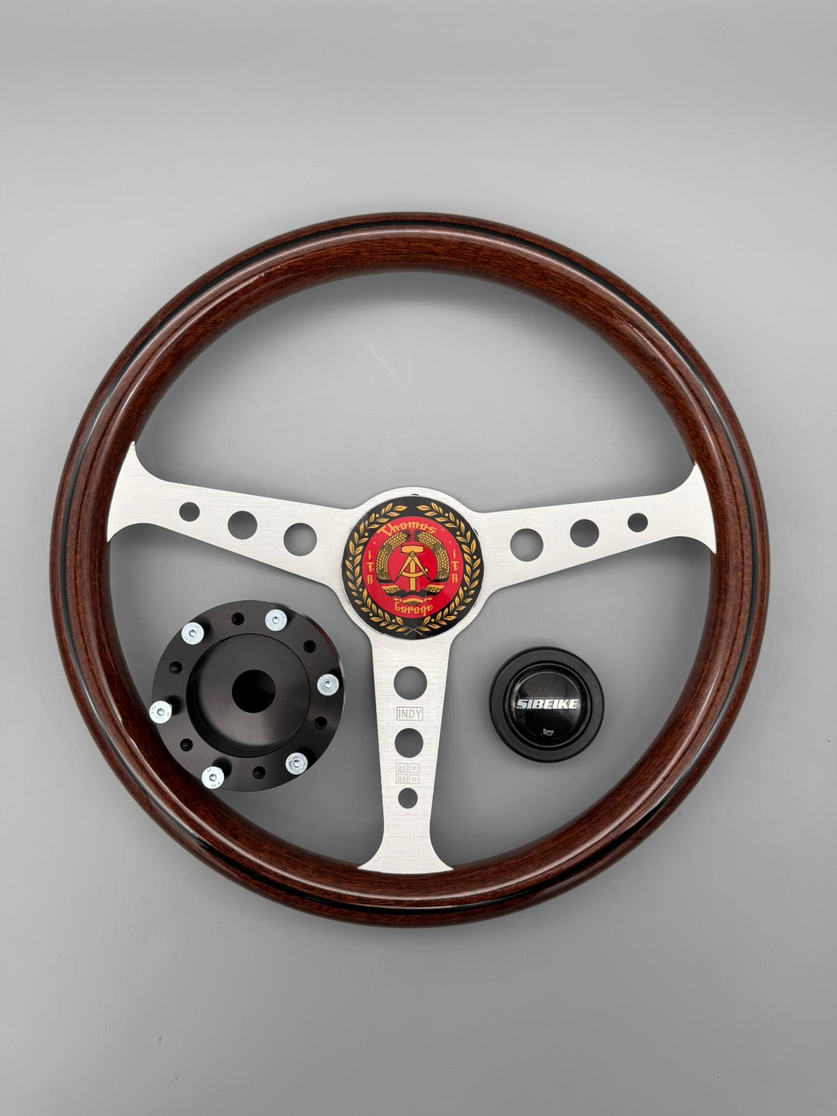 Umbausatz Sportlenkrad Trabant (Typ 2 – 350mm x 50mm – Holzoptik / Stern silber)